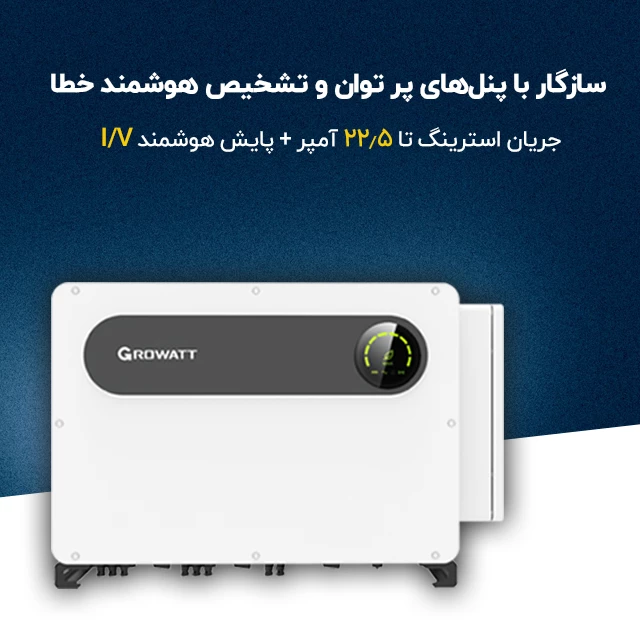 یکی از ویژگیهای مهم این مدل، پشتیبانی از جریان رشتهای تا 22/5 آمپر است که امکان استفاده از پنلهای نسل جدید با توان بالا و سلولهای بزرگ (مانند 210 میلیمتری) را فراهم میکند. همچنین نسبت DC/AC تا 1/5، به مهندسان و نصابان اجازه میدهد تا با طراحی بهینه، توان خروجی سیستم را به حداکثر برسانند و هزینههای نصب را کاهش دهند.